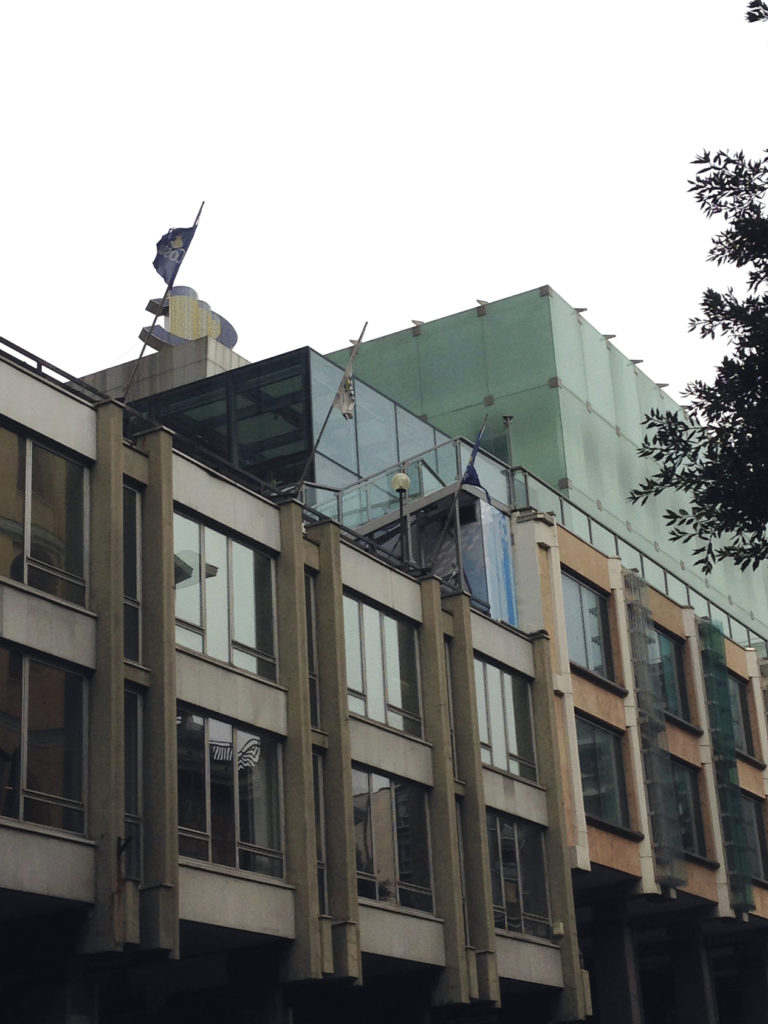 Il progetto comprende una scala esterna realizzata in struttura di acciaio e una scala interna delimitata da un cubo in lastre di vetro laccato in armonia per forma e materiali con il contesto di Palazzo Costa e della Piazza Coperta.