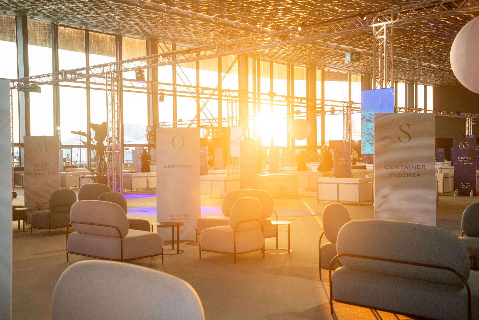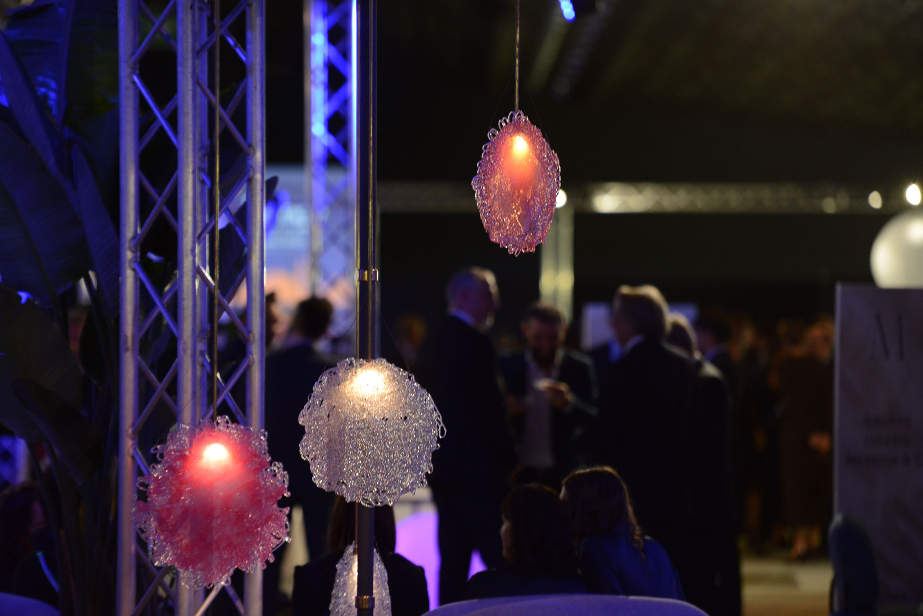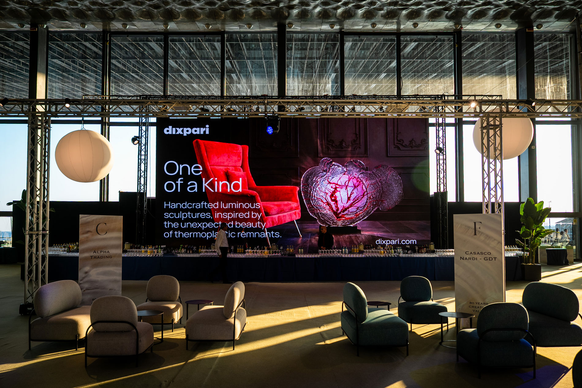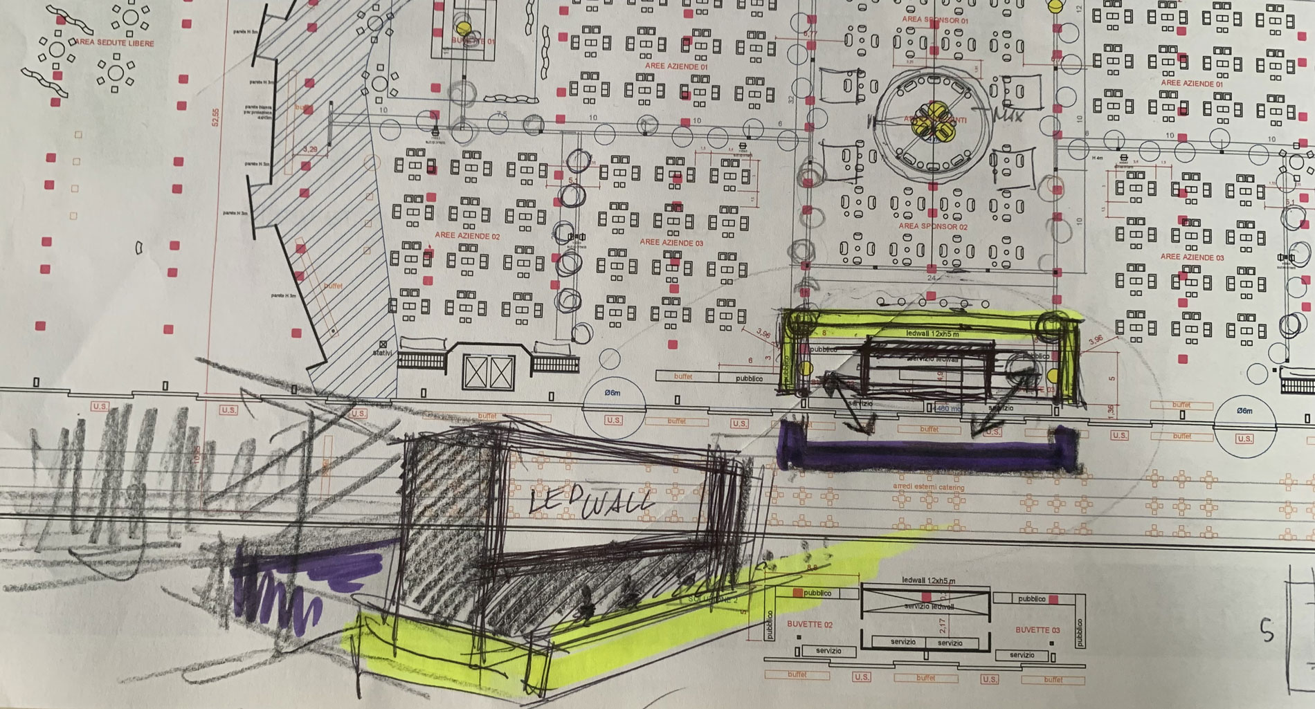 Nello spazio ampio, vuoto e forse dispersivo del padiglione Blu, abbiamo immaginato una storia costruita su un concept chiaro ed efficace; una poesia fatta di atmosfere suggestive che “emozioneranno” gli ospiti conferendo all’ambiente glamour e magia: